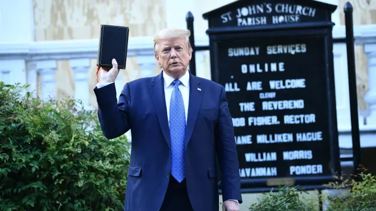 (on the left) President Donald Trump holds up a Bible in front of St John’s Episcopal Church after walking across Lafayette Park from the White House in Washington, DC on June 1, 2020. (on the right) "Let's Make America Pray Again." The Bible is being sold for $59.99 and is described on its website as "the only Bible endorsed by President Trump".