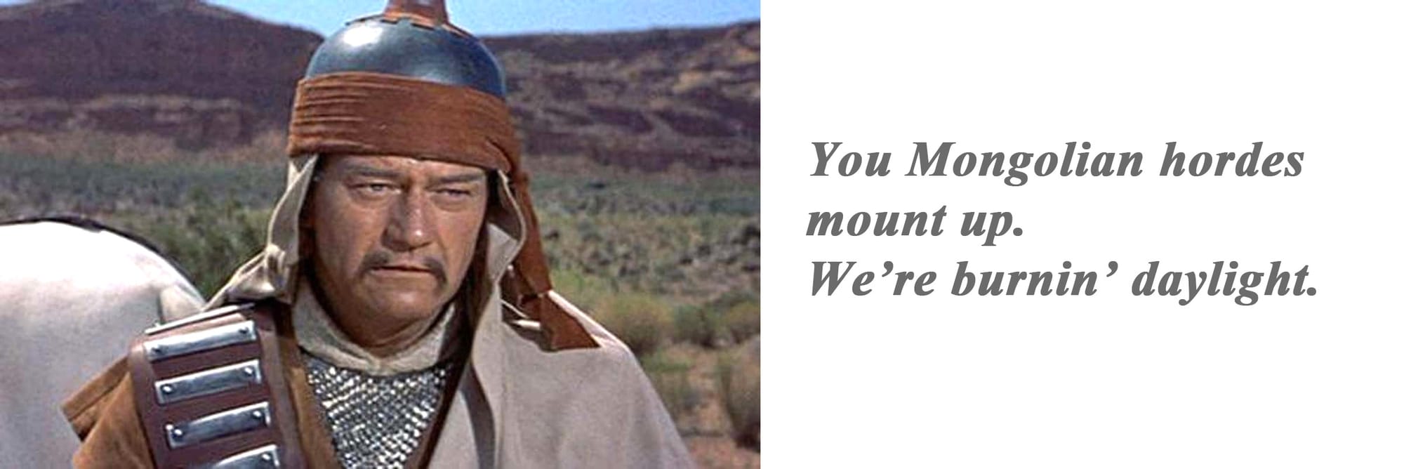 - as a final trivia note: Here is John Wayne as Genghis Khan in The Conquerer. Generally agreed to be the worst movie he ever made, and one of the worst movies of all time. It featured Wayne in that weird condom-style-helmet, and a Fu Manchu mustache. He must have felt like the horse's butt he's pictured in front of although he had only himself to blame. The story goes that he found the script in director Dick Powell's office trash can, read it, and demanded the part. Powell and others tried to dissuade him, but playing the famed conqueror seemed perfect for Wayne's masculine, kick-some-ass image. When the reviews came in and the audiences didn't, he regretted it immensely. (Wouldn't he be proud of his takeover of China in today's political climate?)