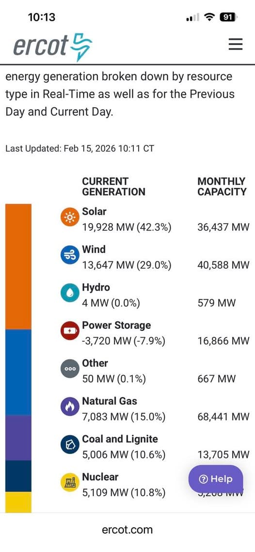 Jerry Patterson is a Republican, former Marine and Texas Land Commissioner from 2003 to 2015. He became a believer in renewable energy and helped bring the state to a leadership position in solar and wind. He still publishes daily reports from the misnamed Electric Reliability Council of Texas on where we are getting our juice. Here is the report from today, Feb. 15 as I write this...