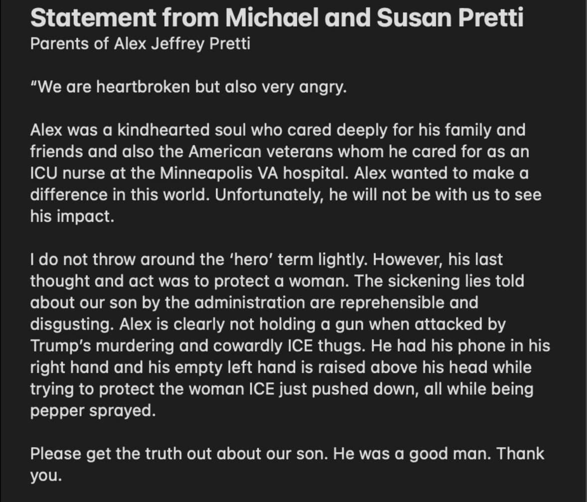 Alex Pretti was the murdered victim in the ICE attack. His parents released a statement about the incident.