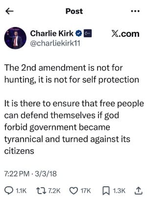 Alex Pretti, the recent ICE murder victim, was allegedly carrying a gun (with a permit). Bill Essayli, the first assistant U.S. attorney for the Central District of California, wrote on social media that “If you approach law enforcement with a gun, there is a high likelihood that they will be legally justified in shooting you.” Hmmmmm. Doesn't really sound like something a good right-winger would say, does it? In fact, the National Rifle Association proclaimed his statement "dangerous and wrong." They know that, agree or not with the particulars of what's happening in Minneapolis, their take on the Second Amendment is all about having guns to defend oneself against that whole tyranny thing.