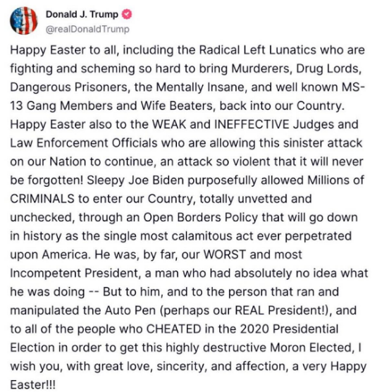 So, in the true Presidential spirit, Happy Easter and Passover to all you radical left and right-wing lunatics out there.