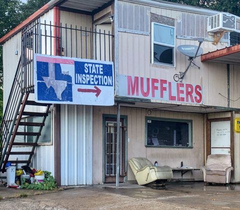 Starting about 15 years ago, on a series of long walks through my hometown of Houston, I began taking pictures of abandoned shopping carts, street couches, and “muffler men,” those hand-welded sculptures of humanoids that mechanics assemble out of auto parts and put out in front of their garages. Then, as it became apparent they were an endangered species, I started shooting pay phones. But more recently, my interest has moved to a very particular but ubiquitous type of business sign: the official state of Texas inspection signboards you find at every auto garage in our state.