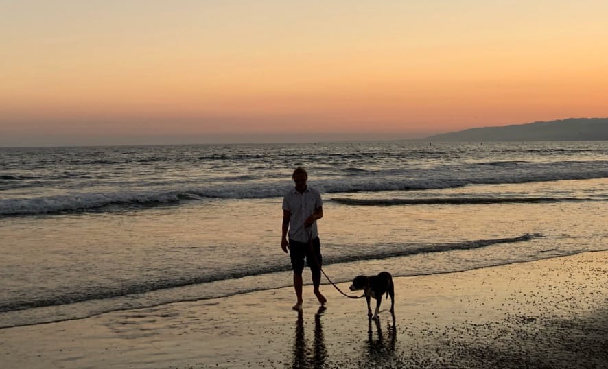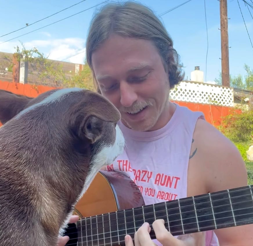 It would be he and Fi. And they fell in love with each other. My son (aka 'the boy' or Gage) is a musician and started out his young career pulling overnight shifts at one of LA's famed recording studios... as a gopher (a concierge, a valet, a janitor). It wasn't long before he worked his way up to engineering recording sessions and writing with well-known musicians. The studio would close down after the pandemic; by then, he had fashioned a home recording studio. Fiona was always supportive. Always up for an after-work walk on the beach or a weekend camping trip. Always up for kisses. And incredibly, always up for listening to the boy play guitar or piano, resting her head right by the instrument, or curling up by a speaker. She was his biggest fan, and he, hers.