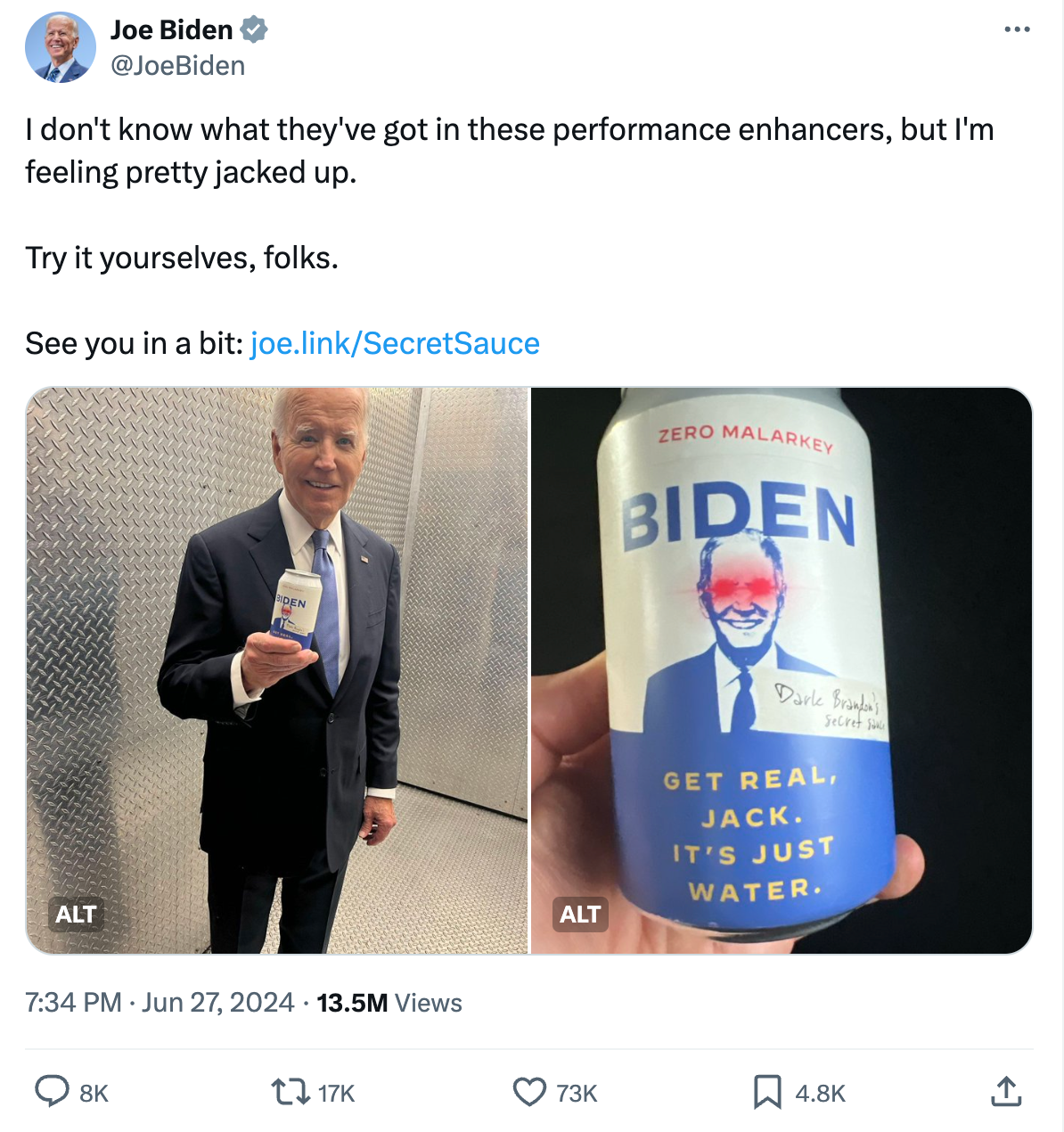To the Biden team's credit, they ran with it. He even released a photo of him with his own can of "secret sauce."