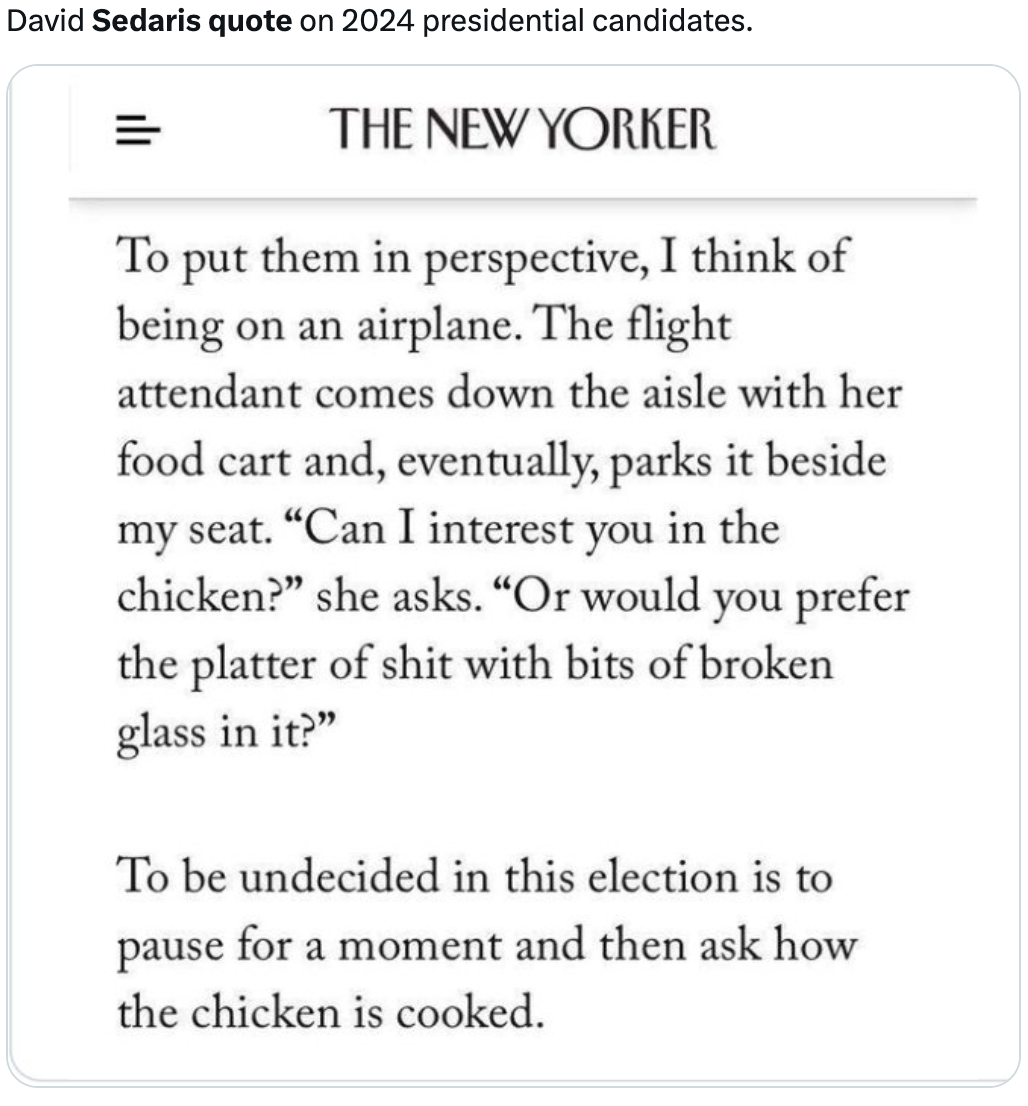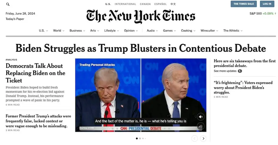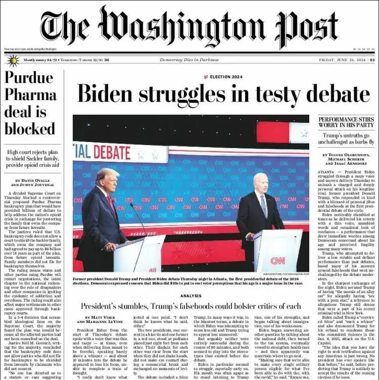 If Trump is a firehose of crap, the media is Niagra Falls. One constant, 24/7 blather about poor old Joe. Time for Joe to Go! No mentions of the big lies like "post-birth abortions." No calling out Putin's protégé on his assertion that Biden "indicted me because I was his opponent."... that kind of stuff is just normal, now. The headlines focussed on how Biden was finished. And stories about Trump's attacks, "<Biden> allowed millions of people to come in here from prisons, jails and mental institutions." No one cried foul on that one, either, but it makes a great soundbite for Hannity and Tucker and Shapiro to play over and over and over. And over and over.