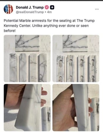 It's OK, America. The Great Donald Trump is picking out marble armrests for the Center. Unlike anything ever done or seen before! Ever! Ever! Ever!