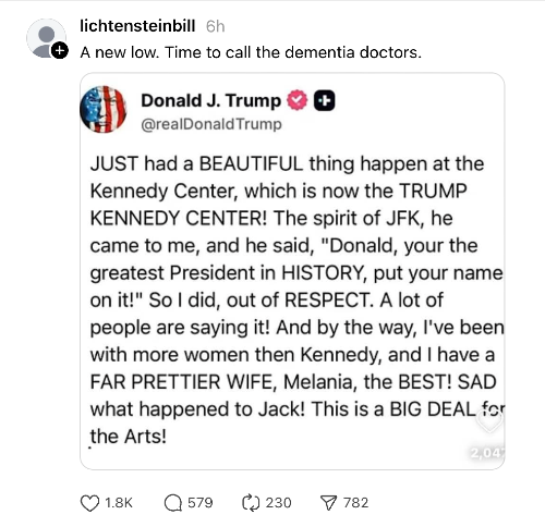 You've all heard by now that the once great John F. Kennedy Center for the Performing Arts is now 'officially' The Donald J. Trump and The John F. Kennedy Memorial Center For The Performing Arts.