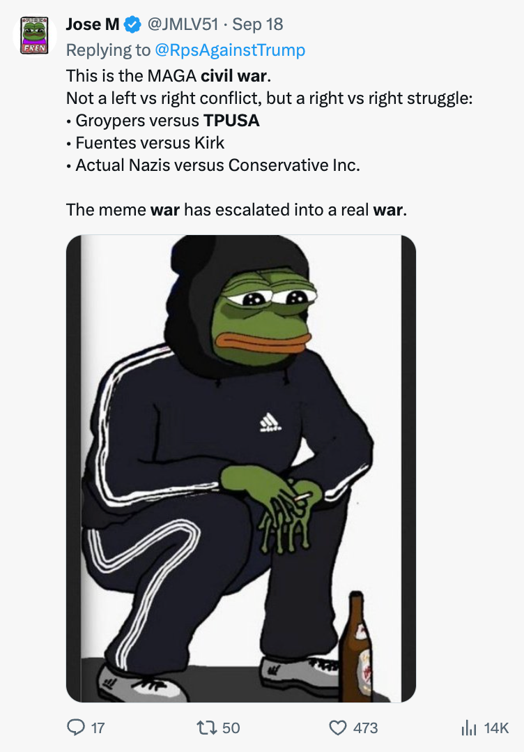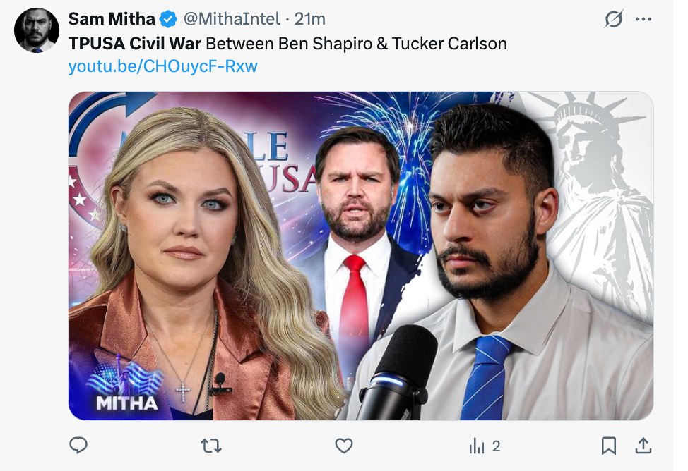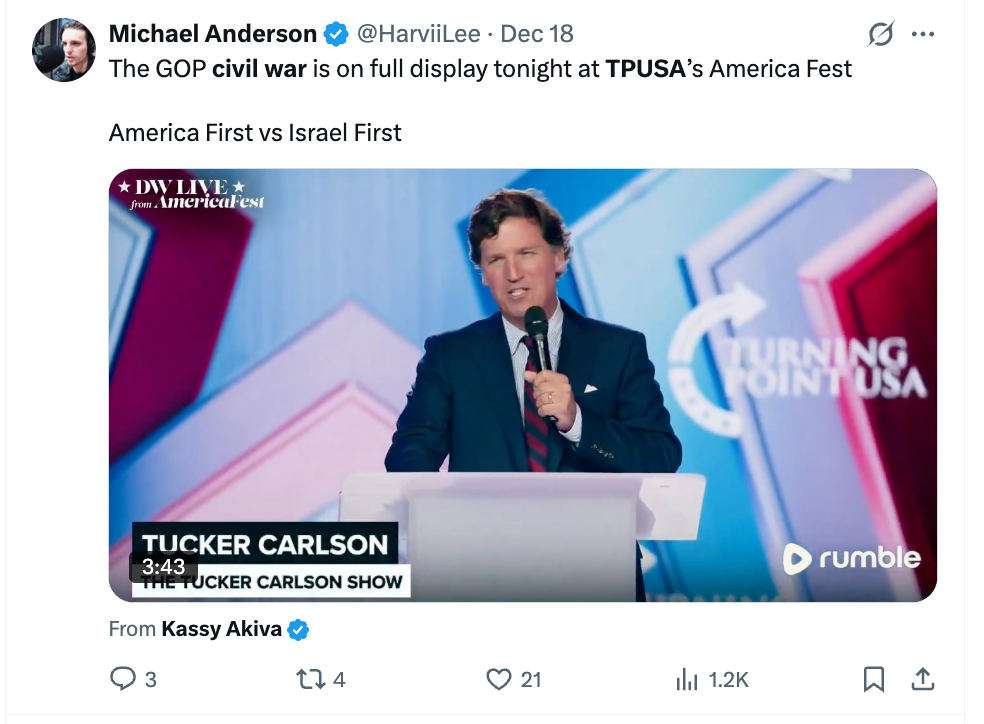 I almost forgot, the ratings for the interview were so abysmal that Weiss canceled an "all-hands" town hall meeting with the news staff that was scheduled for a few days later. Usual ratings for that time slot were around two million viewers. Even with an excellent lead-in to the interview (the Army-Navy football game, which had about 7.3 million viewers) the audience dropped off to about 1.5 million. And btw, conservatives didn't much care for the interview, either. At the TPUSA conference which followed a few days later, Ms. Kirk failed to unite the now factioning special interests in the MAGAsphere. Many are calling it a GOP civil war.