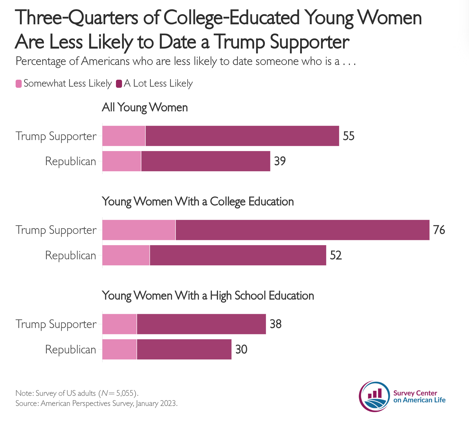 In a survey done this year by the American Enterprise Institute, (a right-leaning think tank,) three-quarters of young college-educated women say they would be less inclined to date a Trump supporter. Over half of all young women wouldn't bother with a Republican.