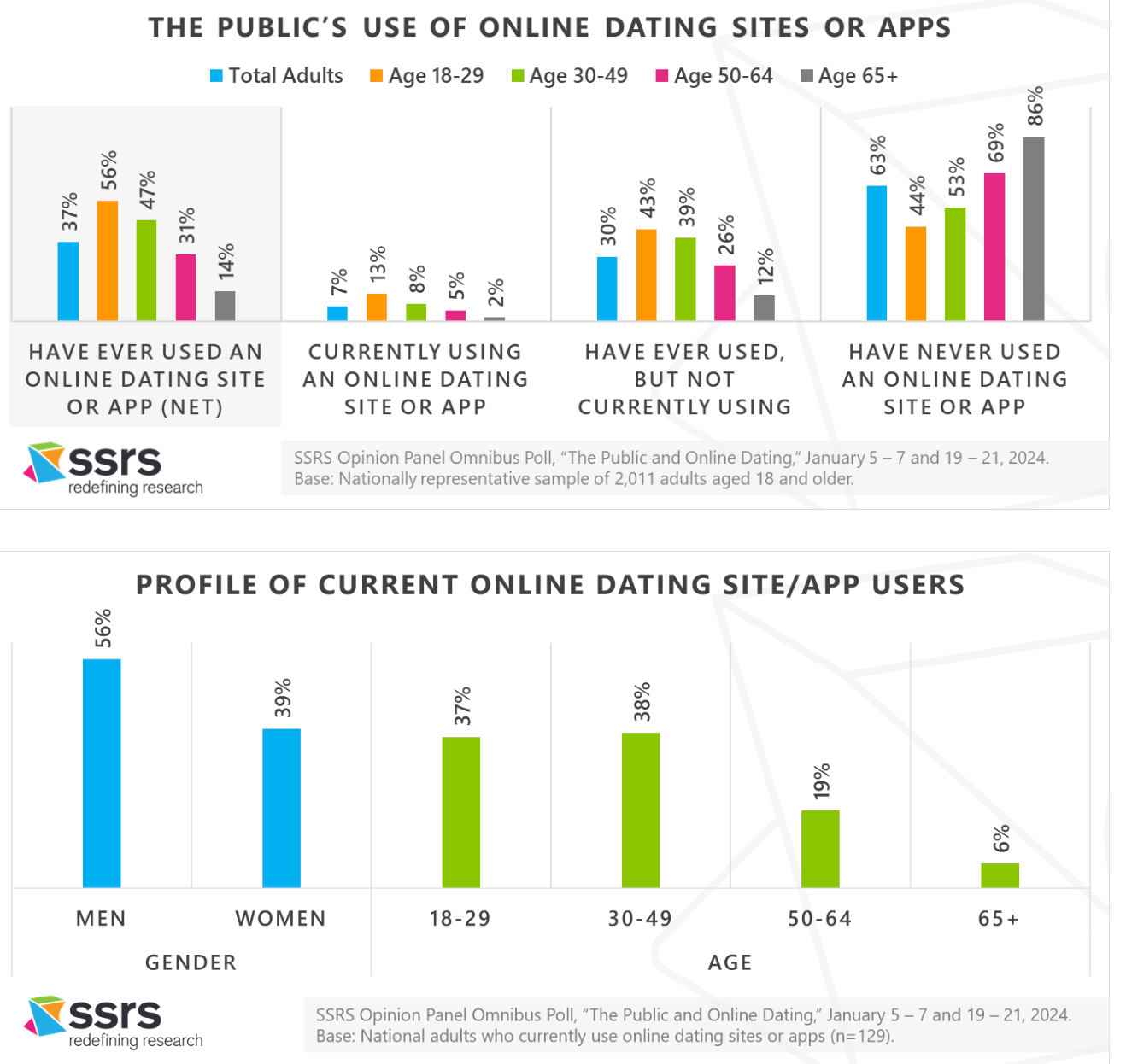 According to Social Science Research Solutions, between 30% and 43% (depending on age cohort) have used dating apps. Compare how many men vs. women use these sites. 56% of men are chasing 39% of women. The odds are against online males even before they select a political affiliation.