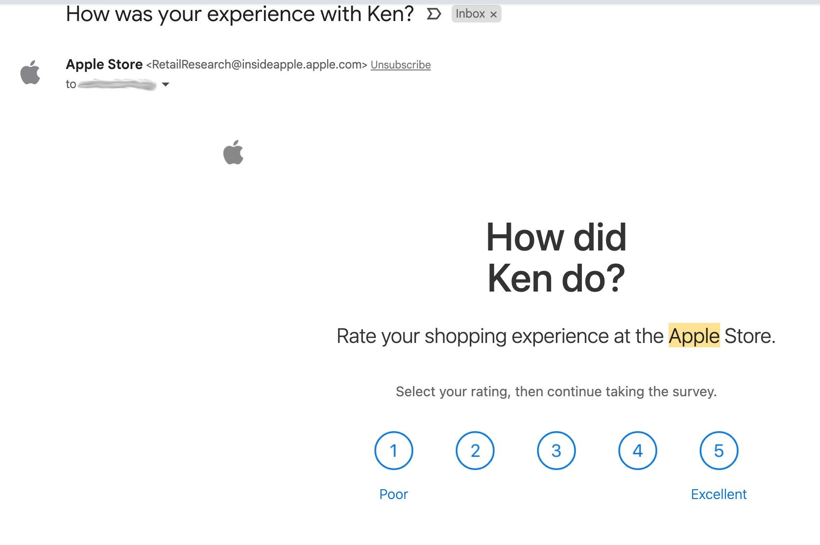 I wasn’t out of the shopping center when my phone dinged with a new email. From the Apple Store. They were looking to audit/survey Ken.